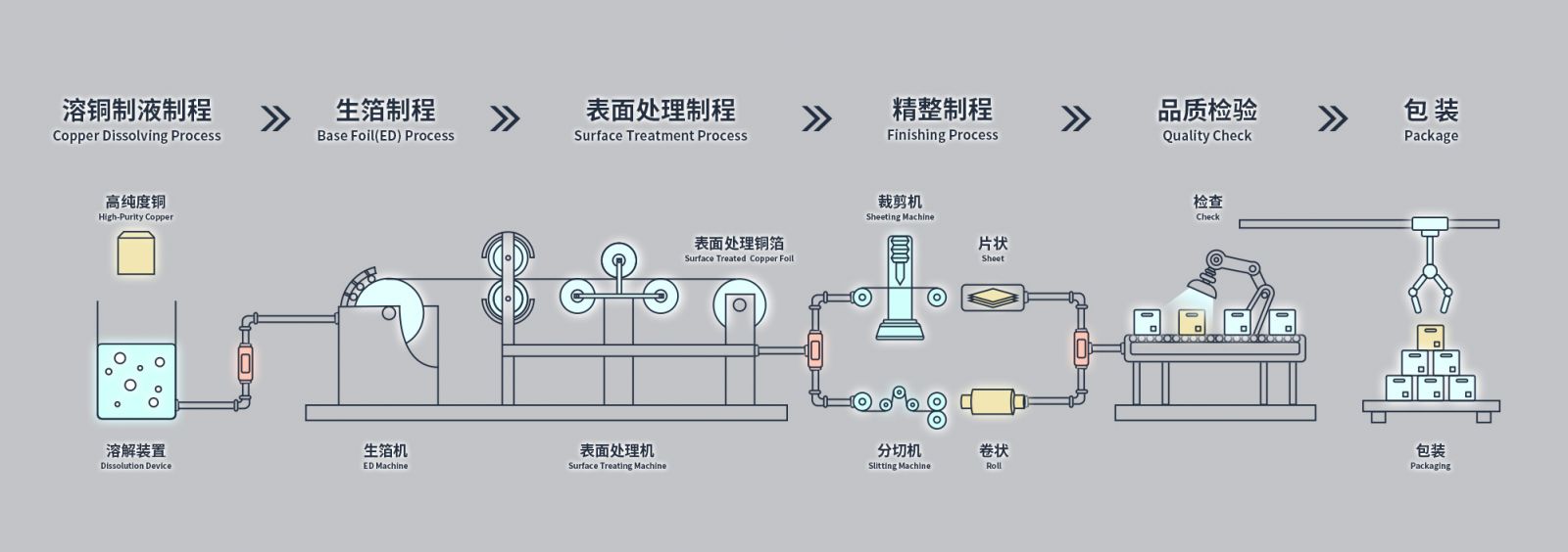 电解铜箔是通过电化学沉积工艺制成的超薄铜材料。将高纯度铜料溶解于硫酸溶液,形成高纯度硫酸铜电解液;随后电解液进入生箔机电解槽,以高精度金属辊筒为阴极,在直流电作用下,铜离子均匀"镀"在阴极辊表面,形成薄铜层;经过连续转动、酸洗、水洗、烘干、剥离等多道工序,最终收卷形成卷装原箔。