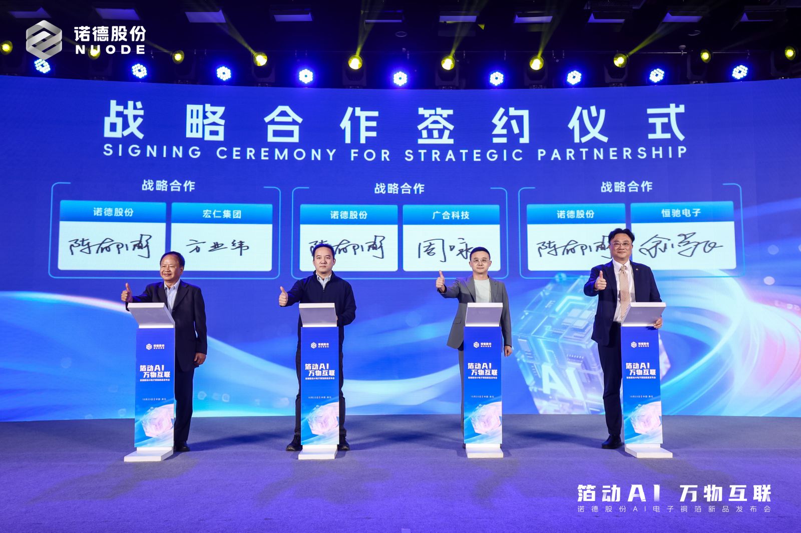 10月25日,诺德股份于湖北黄石基地隆重举办“箔动AI 万物互联”AI电子铜箔新品发布会。本次活动汇聚政府领导、行业专家、产业链伙伴及媒体代表们,共同见证AI时代诺德股份全系列电子铜箔新品的发布。通过行业大咖主题演讲、新品发布及战略签约三大核心环节,为高端铜箔技术革新与产业链协同发展注入强劲动能。
