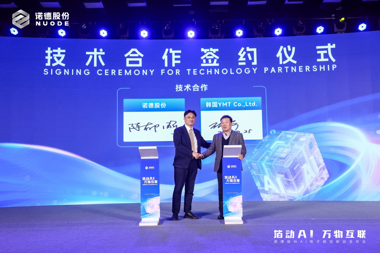 为推动技术落地与生态共建,诺德股份在现场与宏仁集团、广合科技、恒驰电子签署产业链战略合作协议,强化从研发到量产的全流程协同;并与韩国上市公司YMT签订载体铜箔技术合作协议,共同推进封装基板用铜箔的技术迭代与国产化进程。