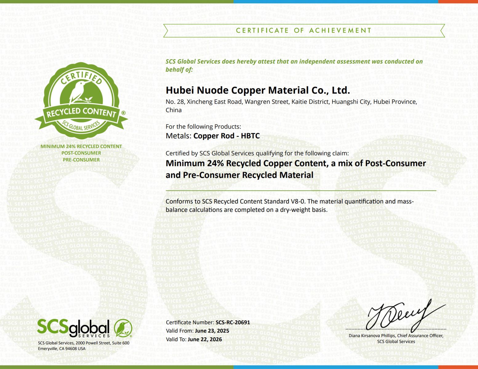 近日,经全球权威认证机构SCS Global Service(美国全球科学认证体系)的严格审核,诺德股份旗下湖北诺德铜材有限公司的铜杆和铜线产品,成功获得翠鸟认证(SCS Recycled Content Certification)。该认证验证其产品中含有不低于24%的回收铜材料。